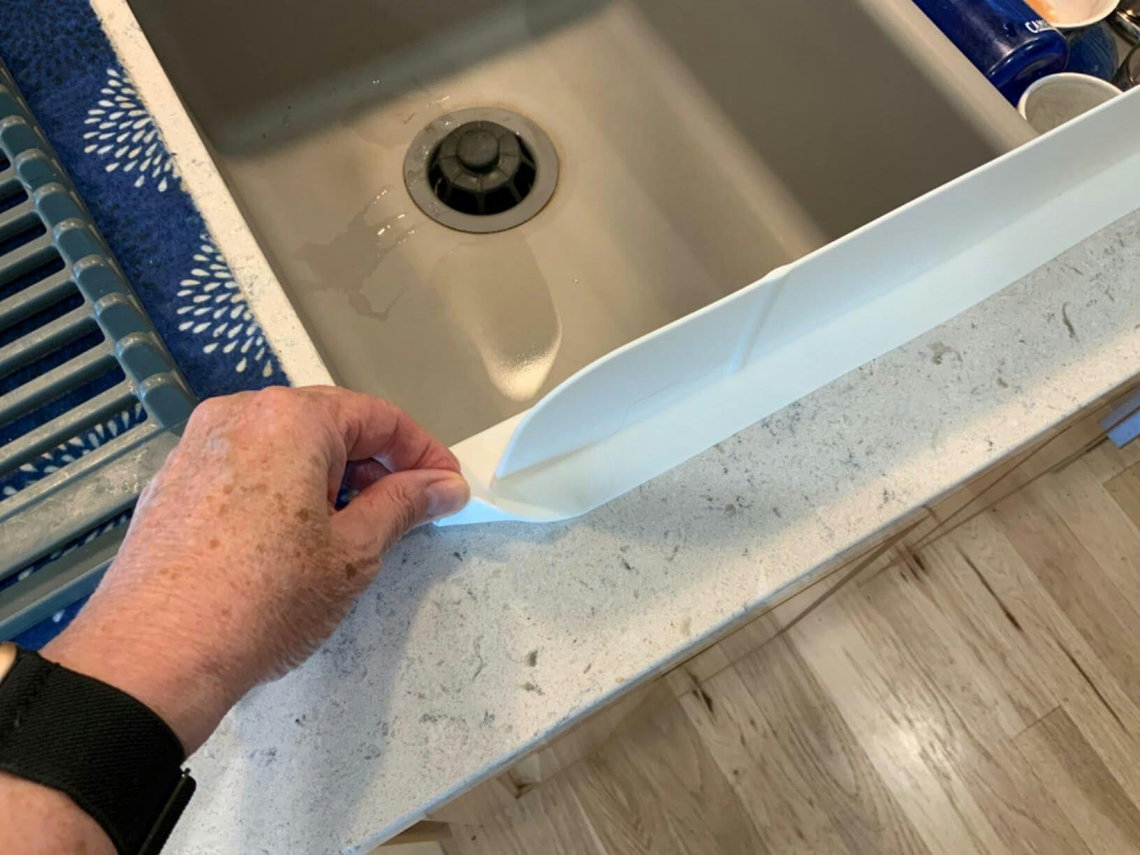 The video showcases the product in use.The video guides you through product setup.The video compares multiple products.The video shows the product being unpacked.Video Player is loading.Click to play videoPlayMuteCurrent Time /Duration Loaded: 0%Loaded0%Stream Type Seek to live, currently behind liveLIVERemaining Time -Playback RateChaptersDescriptionsdescriptions off, selectedCaptionscaptions off, selectedAudio TrackFullscreenI needed something long. I did not want suction cups. You can see in the short video how well it adhears. When you pick it up on the corner of pull off. I toss it in the dishwasher when I want it cleaned beyond my just running the rag over it. I am a messy sink user type person. My stomach would get really wet but I'm not having that anymore. I had recently gotten wet and realized that it was in the dishwasher. Within the first few days of having it, my husband said he really liked having it there as well. This could also be used behind the faucets. We don't keep anything that a few sprinkles would ruin so I don't really need a second one. I know someone that does keep her on the back rather than the front.